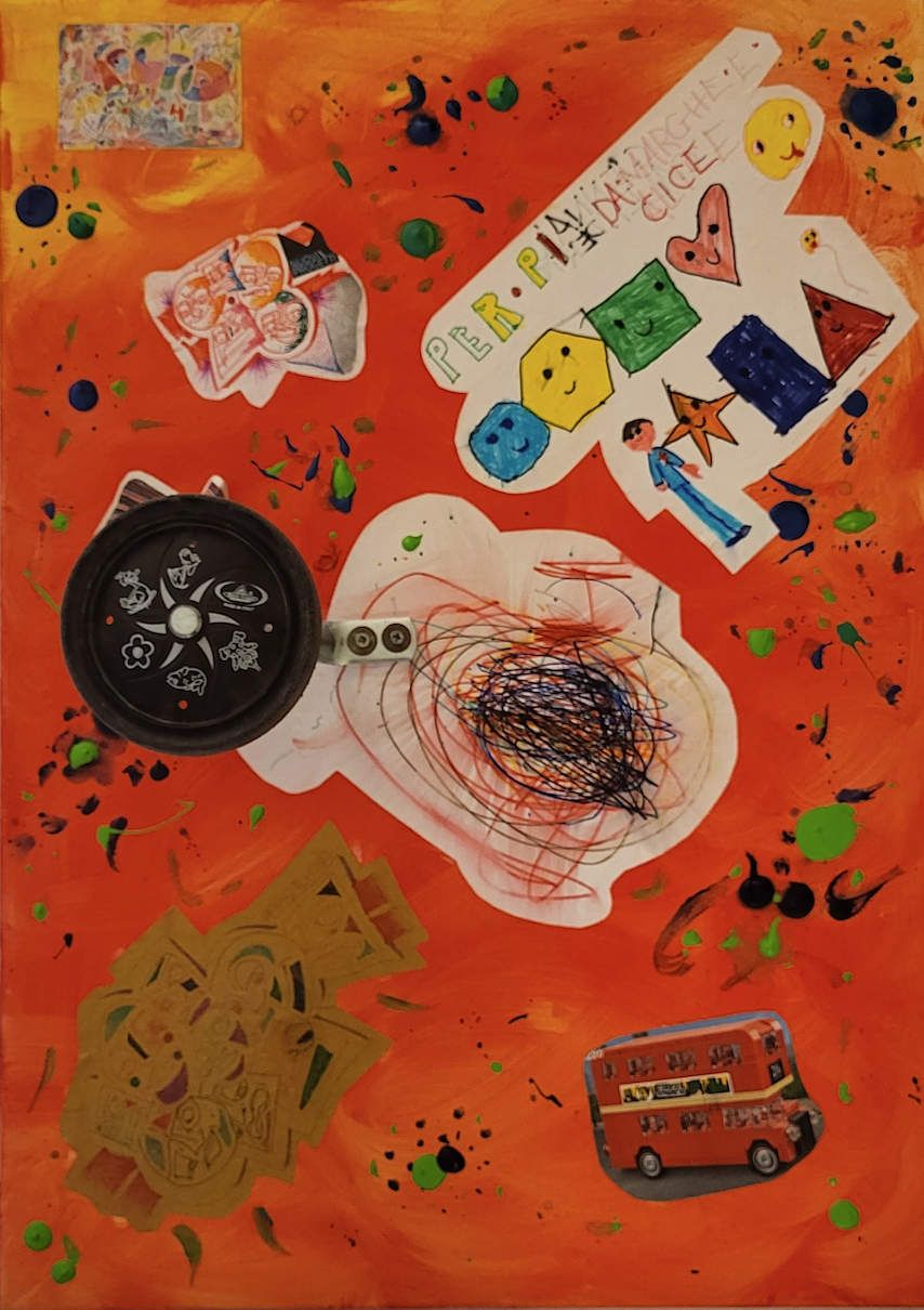 At the center of the composition, an iconic English bus becomes a symbol of movement and interconnectedness — instantly recognizable, universally relatable. Surrounding it, children’s drawings and the wheel of a child’s bicycle evoke innocence, imagination, and the future. These elements also mirror the rotating galaxies, referencing the cosmic cycles that continuously generate life.